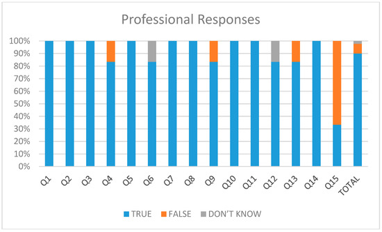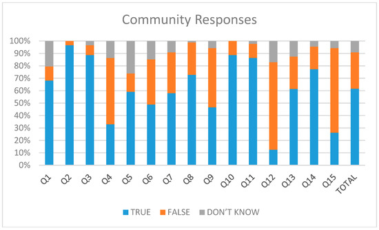 In Section 1 of the questionnaire, a lack of knowledge is tested against 15 questions prepared from the literature. The charts in Figure 9 and Figure 10 show responses from the local community and professionals for each question from the conducted questionnaire followed by relevant discussions.
