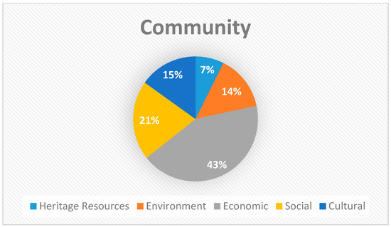Regarding Figure 11, the local community living in the walled city of Famagusta highlighted that any development plan which will be put into action needs to consider economic development first, followed by social, cultural, and environmental factors, with heritage resources at the bottom. With a different point of view, for every 100 units of finance, 43 units need to be spent on economic development, 21 units on social, 15 units on cultural, 14 units on environmental, and 7 units on heritage resource development to be regarded as sustainable development.
