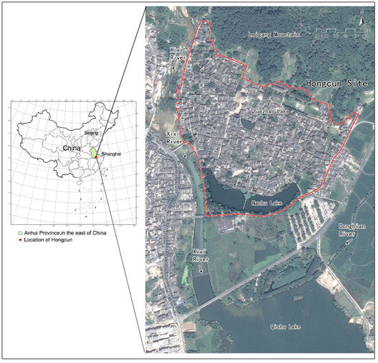 Hongcun is located in the south of China’s Anhui Province (117°38′ E and 30°11′ N), Yi county, Huangshan city (Figure 1). It was founded in the Shaoxi period of the China Southern Song Dynasty (1131 AD) and was originally inhabited by the Wang family (the Wang family is Hongcong Han, leading the construction, planning, and management of Hongcun, and making village rules.). Because of its long history and spectacular environment, Hongcun is known as the “village like a Chinese painting”. It is an outstanding representative of an ancient Anhui village, especially known for its artificial living water system and the aesthetics of its built environment. In 2000, Hongcun, along with another ancient village, Xidi, were added to the UNESCO World Heritage list. UNESCO describes Hongcun thus: “Its street plan, its architecture and decoration, and the integration of houses with comprehensive water systems are unique surviving examples” [46].