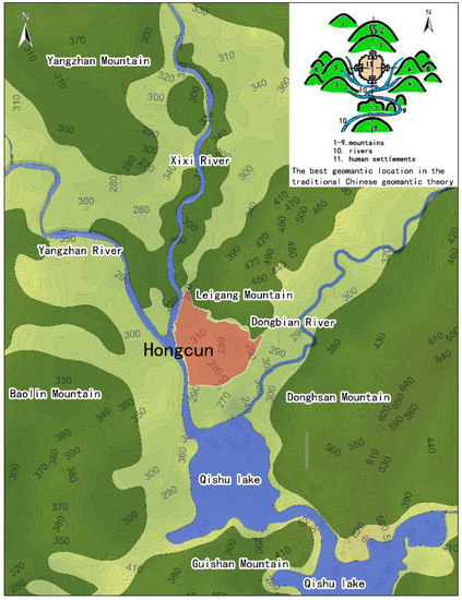 Hongcun is surrounded by mountains on all sides, with Mt. Leigang nearby to the north, Mt. Donghsan to the east, Mt. Baolin to the west, and Mt. Guishan to the south at a relatively long distance. In addition, the village has water sources on three sides: the Xixi and Yangzhan rivers meet west of the village, the Dongbian river runs to the east, while to the south lies a big Lake called Qishu (Figure 4). The village faces south and is surrounded by water and mountains, which is the optimum situation within the traditional Chinese geomantic theory (Figure 4).