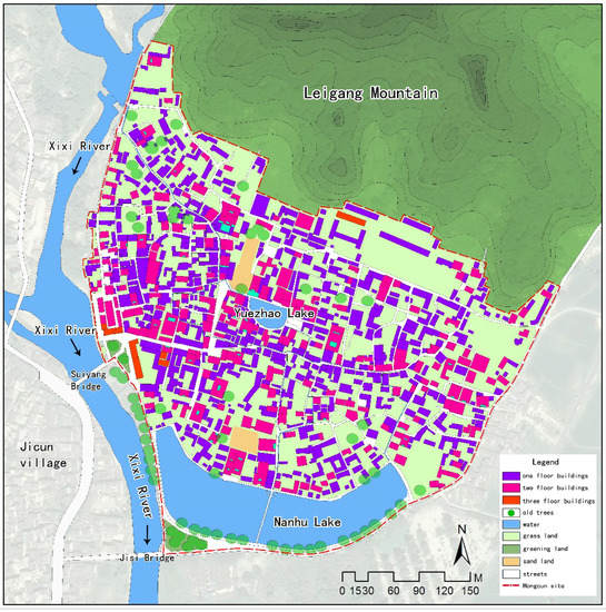 The planning and construction of Hongcun has been studied by Chinese scholars. Wu [57] suggests that the characteristics of Hongcun include the pursuit of an ideal state of “harmony between man and nature”, the ingenious combination of landform and landscape, and vast street and water channel space. Wang [58] explored the historical processes underlying water system planning and construction in Hongcun, and argues that the water system represents the traditional settlement’s pursuit of perfection within an ideal living environment. Li [59] explored the wisdom of rainwater management in Hongcun, including the combination of stagnation, storage, and discharge. This paper will focus on the key planning and construction characteristics of site selection, master plan, architectural layout, land use, and water system in Hongcun.