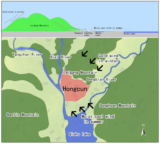 The entire village is approximately two meters higher than the Xixi River to the west, allowing easy water access while simultaneously limiting the risk of flooding and ensuring the ecological security of the village (Figure 4). In addition, in summer, the prevailing wind direction is south or southeast, and in winter it is north or northeast. Mt. Leigang lies to the north, at an altitude of 340–470 m, and a height relative to Hongcun of 60–190 m. This mountain, combined with the open area of Lake Qishu to the south, creates a microclimate of moist, cool wind in summer along the south-to-north incline. In winter, cold wind is blocked by Mt. Leigang (Figure 7), thus suggesting that pre-existing local knowledge of the terrain and climate was used to regulate the local climate of the village.