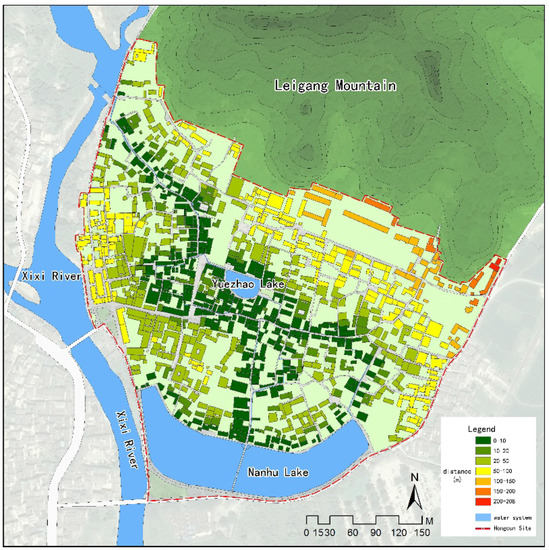 Using GIS proximity analysis to calculate the shortest distance between each building and the water system, it was established that, of the 1055 building blocks in the village, 95.1% are within 100 m of the water system. Only one building is more than 200 m (208 m) away from the water system, while 12 are over 150 m away (Figure 10, Table 6). Because of the layout of the water system, all village residents are in proximity to water for household and agricultural production use. The proximity of the water system also meets the demand for easily accessible water in the event of fire.