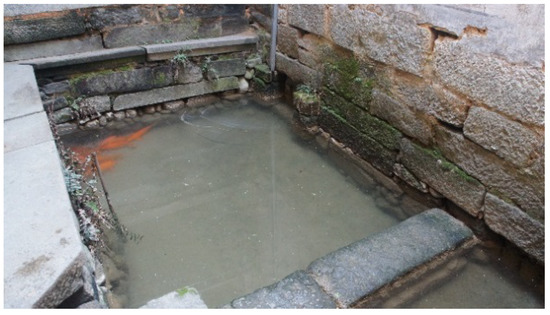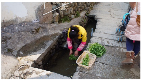 Many smaller canals run off the main canal at the heart of the water system, providing convenient water for household chores, such as laundry and garden irrigation. These canals were the “tap water” of the ancient village, with villagers drinking and washing in the “intestines”. Wang ancestors once had a rule that, before 8:00 am, water in the “intestines” could only be used for drinking, and after 8:00 am it could be used for washing. Because of such management measures, water quality remains good. Today, villagers continue to wash vegetables in the canal (Figure 11), and this water is piped directly into homes for household aquaculture (Figure 12).