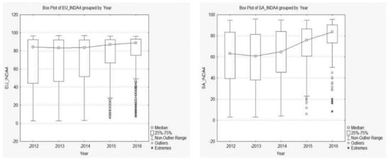 Observing the values of the median (Table 5), it can be seen that, unlike the mean, in the case of Europe the value decreases in 2013 and 2014 (for South Africa, only in 2013) compared with 2012. Moreover, analyzing the values of the medians and quartiles together, it is interesting to note that, without prejudice to the general improvement of the A4R performance indicator over time in both geographical zones, in 2012 50% of companies in Europe and South Africa showed an A4R value greater than 84.23 for the former and only 63.1 for the latter. In 2016, while the median value of A4R in South Africa remained lower, the situation seems to be normalizing. Indeed, the value of the median that divides the distribution in half is 87.1 for Europe and 83.5 for South Africa. Moreover, the integrated performance of companies that had an A4R index in 2012 grows considerably; indeed, 25% of companies that had an A4R value lower than 44.31 in 2012 in Europe have values below 75.0 in 2016, and in South Africa the change is from 39.7 to 73.1.