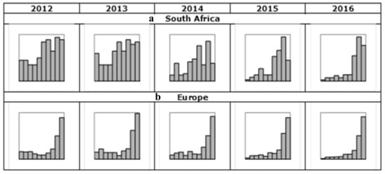 The above observations regarding the shape of the distributions of the A4R indicator in the years in question for each geographical zone can easily be seen in the histograms shown in Figure 3. The frequencies relating to the distributions of the A4R indicator (min = 0; max = 100) were subdivided into 10 classes of width 10 for South Africa (Figure 3a) and Europe (Figure 3b).