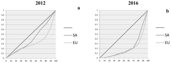 Further confirmation of these observations can be found in the concentration curves (Figure 4) relating to the years 2012 (Figure 4a) and 2016 (Figure 4b), which clearly show that in 2012 the percentage of companies with A4R below 80 is 44.5% in Europe compared with 70.9% in South Africa. As mentioned above, in 2016 the situation was still better in Europe but South Africa (40.1%) narrowed the gap compared with Europe (29.4%), which continued to improve.