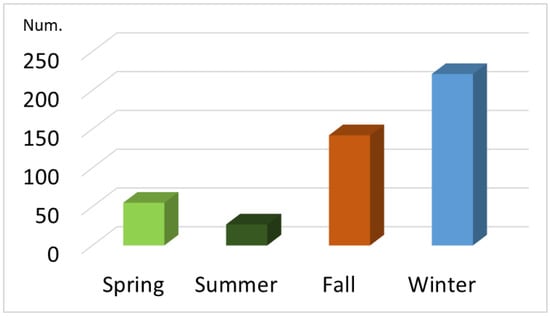 The number of Common Moorhens that appeared in farm ponds varied throughout the four seasons. The greatest number was observed in winter (221 Common Moorhens), followed by autumn (142 Common Moorhens), and the fewest number of birds were observed in summer, only 27 Common Moorhens (Figure 2). This is primarily because the Common Moorhen exhibits the characteristic of familial aggregation in winter [16,33]. During the fallow period of rice farming (approximately October to February), the Common Moorhen gathers at farm ponds and then leaves the area between March and April to search for suitable breeding sites. From May to June, they engage in reproductive behavior in these fixed, pre-determined areas [34]. When harvesting begins in the paddies from July to August, parent birds can be found with juveniles. Subsequently, during the tilling of soil in September, Common Moorhens begin aggregating at farm ponds due to the end of the breeding season. Winter aggregation begins in October and continues until February of the next year.