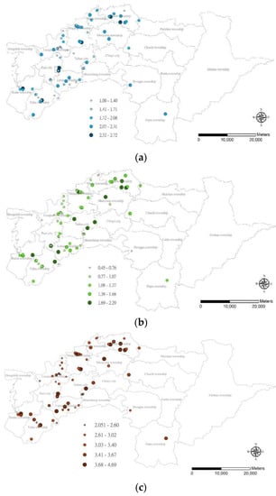 The field evaluation scores for the three factors associated with the external environment were multiplied by their corresponding weight coefficients (Table 2) and then summed up to calculate the habitat suitability score of each pond, as depicted in Figure 3a. The analysis results indicated that the mean suitability score was 1.289, and that higher habitat suitability was observed for the external environments of farm ponds in Dalin, Singang, Shueishang, and Yijhu Townships.