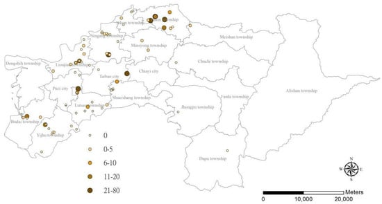 The total number of Common Moorhens that appeared at farm ponds across the four seasons is shown in Figure 2. The results indicated 10 hot spots at which Common Moorhens appeared, and the farm ponds at which the most Common Moorhens appeared were in Dalin Township (Figure 4). Moreover, the total habitat suitability score including farm ponds exhibiting higher scores was also located in Dalin Township (Figure 3c). This was because the farm ponds in Dalin Township were simultaneously the primary habitat of Rhacophorus arvalis, a species endemic to Taiwan [5]. The Chiayi County government has conducted habitat conservation education for community residents in this area and has promoted related conservation programs; thus, local residents are highly aware of farm pond conservation and the conservation of organism habitats [4,5]. This has enabled the farm pond in Dalin Township to become a favorable habitat for both the Common Moorhen and Rhacophorus arvalis.