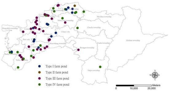 The final weight coefficient was obtained by multiplying the indicator weight coefficient of the first layer by that of the second layer. The results showed that the most essential factors are “pond area” (0.156), “area ratio of farmlands within 200 m of the farm pond” (0.155), and “pond perimeter” (0.146), and that “water-surface-to-bank distance” (0.95) is the factor with the lowest importance (Table 1).