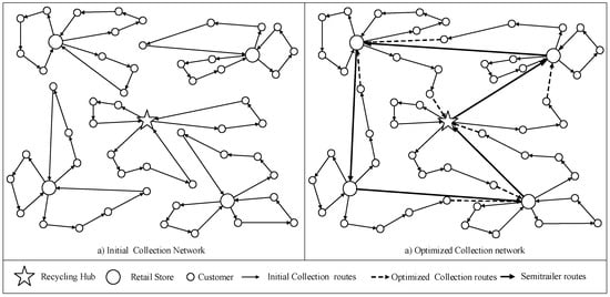 Manufacturing or logistics companies usually have several customers spread all-over a city in need of products collection services, and vehicles daily travel long distances to visit remote customers. Obviously, traditional network optimization approaches can improve the network’s efficiency, but the process is required periodically to ensure long term reliability. Therefore, to achieve a sustainable development and conduct relevant collection operations, the reverse logistics network can be optimized through the cooperation of retail stores and the recycling hub. Retail stores can collect products from various customers by means of small or medium vehicle, and then use semitrailers to connect with the RH for treatment and wastes disposal. In this paper, the RH acts as a coordinator to achieve resource savings through the establishment of the cooperative alliance. The initial collection network and optimized network are shown in Figure 1. The thin solid lines represent the initial collection routes, and the dotted lines represent the collection routes after cooperation. The thick solid lines indicate the semitrailer collection route which consists in visiting every RS before returning to the RH.