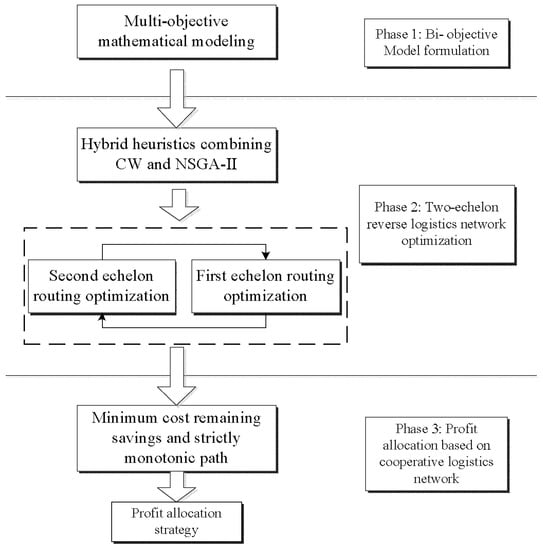 The formation of a cooperative alliance is an effective means of approaching the vehicle routing optimization in two-echelon reverse logistics networks. Cooperative mechanisms can contribute to avoiding the inefficient assignment of resources for the recycling logistics operations and reducing long distance transportation. With regard to the relatively low performance of waste collection, this paper proposes a three-phase methodology to properly address the corresponding vehicle routing problem on two echelons. First, a bi-objective programming model is established to minimize the total cost and the number of vehicles considering semitrailers and vehicles sharing. Furthermore, the Clarke–Wright (CW) savings method and the Non-dominated Sorting Genetic Algorithm-II (NSGA-II) are combined to design a hybrid routing optimization heuristic, which is denoted CW_NSGA-II. Routes on the first and second echelons are obtained on the basis of sub-optimal solutions provided by CW algorithm. Compared to other intelligent algorithms, CW_NSGA-II reduces the complexity of the multi-objective solutions search and mostly converges to optimality. The profit generated by cooperation among retail stores and the recycling hub in the reverse logistics network is fairly and reasonably distributed to the participants by applying the Minimum Costs-Remaining Savings (MCRS) method. Finally, an empirical study in Chengdu City, China, reveals the superiority of CW_NSGA over the multi-objective particle swarm optimization and the multi objective genetic algorithms in terms of solutions quality and convergence. Meanwhile, the comparison of MCRS method with the Shapley value model, equal profit method and cost gap allocation proves that MCRS method is more conducive to the stability of the cooperative alliance. In general, the implementation of cooperation in the optimization of the reverse logistics network effectively leads to the sustainable development of urban and sub-urban areas. Through the reasonable reorganization of the entire network, recycling companies can provide more reliable services, contribute to the reduction of environmental pollution, and guarantee significant profits. Thus, this paper provides manufacturing companies, logistics operators and local governments with tools to protect the environment, while still making profits.
