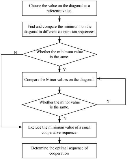 The cost reduction ratio of participant in sequence when member joins the alliance as the participant can be calculated by the Equation (36). The selection of the monotonic path strategy is based on the reduction percentage of each participant. The effective sequence to select should strictly increase. In other words, the best alliance formation sequence should obey the principle wherein the cost reduction rate of participant should monotonically increase; such solution is called a Strictly Monotonic Path (SMP). In cases where multiple sequences satisfy the SMP principle, the process presented in Figure 3 can be followed to select the best.