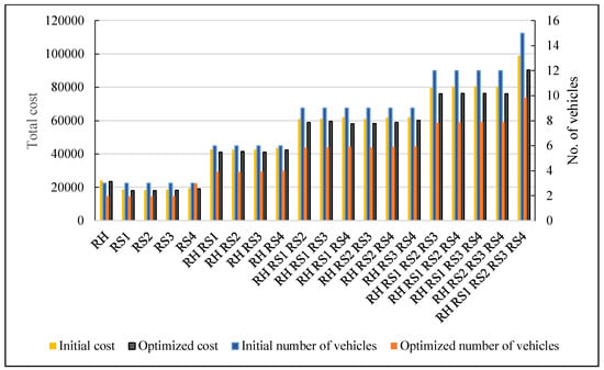 The first column of the illustration, Figure 1a, shows the original collection network when there is no cooperative alliance. In the initial network, due to each facility’s independence, there is no connection among them, and each logistics facility is engaged with its own customers. During routing optimization, the total demand and the vehicle’s capacity generally constrain the assignment and dispatching of the transportation fleet [44]. Overload is generally forbidden and the vehicle should return to the origin after finishing services. In practice, the last visited customer can be very distant from the departure node, and returning can increase the total travelled distance. However, forming alliances among retailers and encouraging vehicle sharing can allow the collection vehicle to move to the closest RH or RS after visiting the last customer. Therefore, long-distance transportation is avoided and costs are reduced.