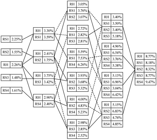 The varying reduction percentages of each participant in the cooperative alliance are depicted in Figure 6. The solid lines indicate that existing facilities in the alliance can accept a new coming participant, and dotted lines indicate that the alliance may break up when a new facility joins. For example, in the first column, when retail store RS1 enters the alliance, it gains 2.25% of the cost savings. After joining RH, the cost savings of RS1 increases from 2.25% to 3.59%, while RH saves 3.30%. In view of that increase, RS1 can agree to join with RH. However, in the next stage, if RS2 joins the existing cooperative alliance, RH’s cost savings rate decreases from 3.30% to 3.05%. As a consequence, the adhesion of RS2 is not conducive to the stable operation of the alliance. Thus, such type of cooperation sequence is referred to as non-SMP based coalition. According to this analysis, we summarize in Table 7 all the sequences respecting the SMP principle.