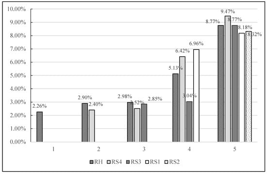 With an increase in the number of participants in the alliance, Figure 7 reveals that the percentage increase of the existing participants is different. When RH singly joins the cooperative alliance, it only gains 2.26% of the cost savings. Further, with the agreement of RS4 to participate, RH’s savings percentage increases from 2.26% to 2.90%; another augmentation is observed after the adhesion of RS3 and reaches 2.98%. Until then, the percentage increase is slight; but when the number of participants reaches four after RS1 adhesion, RH’s cost savings almost doubles (5.13%). The same situation can be verified with other participants.