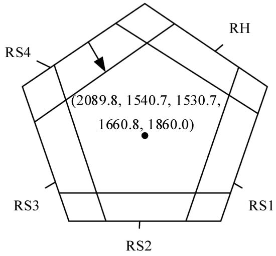 Five participants have joined the cooperative alliance, and constrain the core to form a closed pentahedron. To conveniently describe the core, we represent the pentahedron by a pentagon as illustrated in Figure 8. The five sides represent the five reverse logistics facilities in the network. By compressing each side internally with a non-equal percentage and according to the logistics facilities’ marginal contributions, the core center is reached. Using Equations (33)–(35), and with the variable , we obtain as core solution: (2089.8, 1540.7, 1530.7, 1660.8, 1860.0).