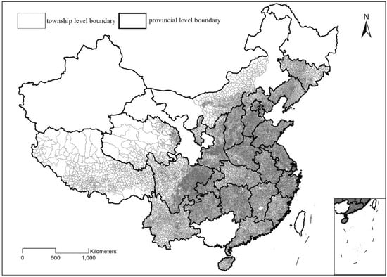 The vector boundary data at the township level were obtained from the Data Sharing Platform of Earth System Science of the National Science and Technology Infrastructure of China (http://www.geodata.cn/). The original boundary datasets were manually digitized from township division maps collected in 2000 at a scale of 1:250,000 in the different provinces of China. Data from Heilongjiang, Guangxi, Xinjiang, and Gansu provinces were unavailable; thus, the vector boundary data at the township level used in this study covered 27 provincial regions, including Liaoning, Jilin, Inner Mongolia Autonomous Region (part), Beijing, Tianjin, Shanghai, Hebei, Henan, Shaanxi, Shanxi, Ningxia, Shandong, Anhui, Jiangsu, Hunan, Hubei, Jiangxi, Zhejiang, Fujian, Guangdong, Hainan, Yunnan, Guizhou, Sichuan, Chongqing, Qinghai, and the Tibet Autonomous Region, as shown in Figure 1. The Hong Kong Special Administrative Region, Macao Special Administrative Region, and Taiwan province are not included in this study.