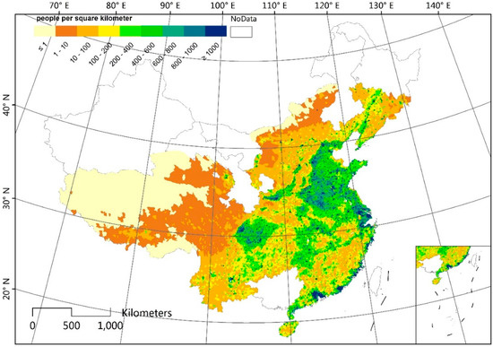 The CnPop dataset was obtained from the Data Sharing Platform of Earth System Science of National Science and Technology Infrastructure of China. It is a national-scale dataset that covers mainland China with a spatial resolution of 1 km using census data at the county level and land use data at a scale of 1:100,000 as inputs [18]. There are two steps used to generate CnPop: (1) estimate the population density of each land use type using the least squares method in each sub-region; and (2) calculate the population in each grid cell on the basis of the population density and area of each land use type.