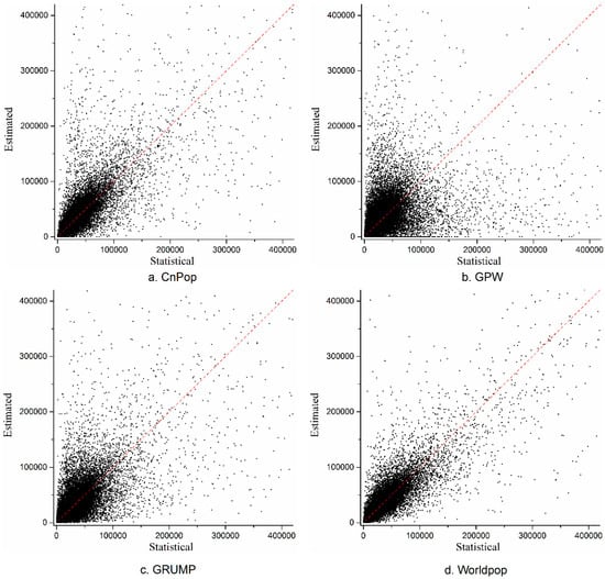 Table 3 shows the RMSE, MAE, and MAPE values for the estimated and demographic population counts for each dataset. Of the three indicators, WorldPop has the lowest values, followed by CnPop, GRUMP, and the GPW. The MAPE value for WorldPop (42.44%) is the smallest and is marginally smaller than that for CnPop (42.77%). This suggests that WorldPop is more accurate than CnPop, GPW, and GRUMP. However, the estimation accuracy of CnPop is close to that of WorldPop and better than that of GRUMP and the GPW. Because GRUMP distributes large populations across major urban areas and then uses areal weighting to allocate the remainder of the population to rural regions, while the GPW uniformly distributes the population across each county level administrative unit, the estimation accuracy of GRUMP is better than the GPW. It is noteworthy that the difference between the RMSE and MAE values for all four datasets was significant, which suggests that the variances in the individual errors were large and had the same various trends shown by the MAPE.
