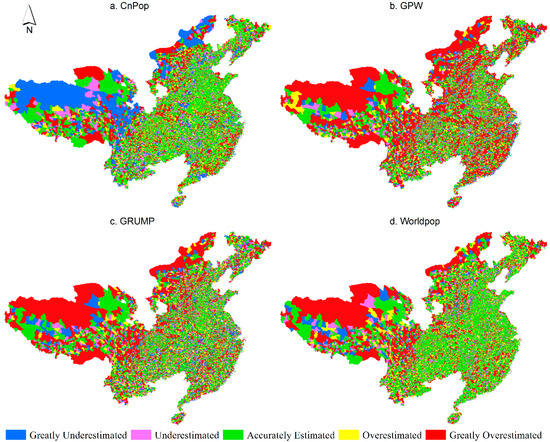 To identify the unbalanced distribution pattern of the REE, the average population density of each REE range for the four datasets was calculated as i, shown in Figure 6b. For CnPop, the average population density was significantly lower in the greatly overestimated or underestimated ranges, indicating that the land use/land cover model failed to redistribute the population well in sparsely populated areas. The values of the underestimated and accurately estimated ranges were approximately the same, which shows that the heterogeneity discernibility of CnPop needs to be improved in densely populated areas. The values that corresponded to the GPW sharply decreased from the greatly underestimated range to the greatly overestimated range, suggesting that the areal weighting interpolation method cannot redistribute the population well since the average density of the administrative units can significantly magnify the population density of sparsely populated areas and suppress that of densely populated ones. In comparison to the GPW, the average population density of the greatly underestimated units of GRUMP decreased by half and those of both underestimated and greatly overestimated marginally increased, illustrating that auxiliary data such as night-time light images could discriminate some populated areas, but a few populated areas remained unidentified because the average population density of the greatly underestimated units was still relatively high. The average population density of the greatly overestimated ranges was the smallest for the WorldPop dataset, showing that this dataset greatly overestimated the population distribution over a wide range of sparsely populated areas. Meanwhile, the average population density of the underestimated, accurately estimated, and overestimated ranges progressively decreased, illustrating that the fixed estimated population densities of different land cover types could not exactly conform to the real population distribution across China. An interesting observation was that the values of the accurately estimated ranges for the four datasets were about 200–260 people per km2, which suggests that the areas within this population density value range are easy to characterize with a high accuracy.