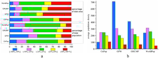 Characteristics of relative estimation error for the four datasets, (a) percentages of the total population and total area in different error ranges for CnPop, GPW, GRUMP and WorldPop; (b) average population density of CnPop, GPW, GRUMP, and WorldPop in each REE range.