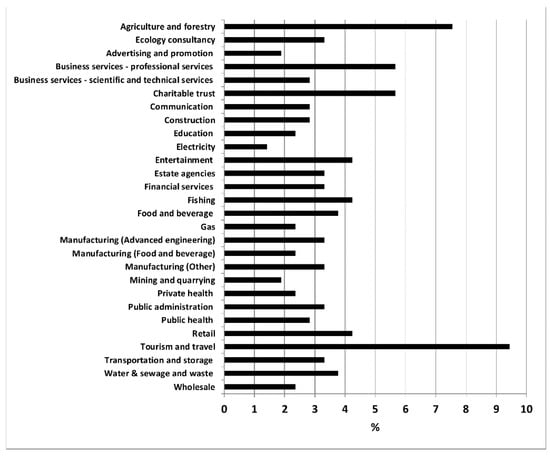 After indicating their business sector in question one, responses were elicited using a three-point (questions two and three) or six-point (question four) Likert scale [32]. The survey was conducted by a single emailing of 2000 questionnaires followed by two follow up reminders sent over a four-month period (July–October 2017). The link to the survey was also promoted via social media and online forums with the purpose of reaching businesses not represented in the local business directories. A response rate of 10.6% (212 participants) was received which is consistent with the relatively low response rates typical of online surveys [33]. However, the sample responses covered a reasonably good representation of different sectors (Figure 2). In development of question four we considered five ecosystem service classifications (The Millennium Ecosystem Assessment, [34]), The Economics of Ecosystems and Biodiversity classification (TEEB, [13]), UK National Ecosystem Assessment (NEA, [35]) Common International Classification of Ecosystem Services (CICES, [36]) and The Final Ecosystem Goods and Services Classification System (FEGS-CS, [37]). These were used to produce a combined list of 26 services that were included in the survey. In line with the above TEEB study ES were defined as “the direct and indirect contributions of ecosystems to human well-being” and were categorized into provisioning, regulating, cultural, and habitat and supporting services.