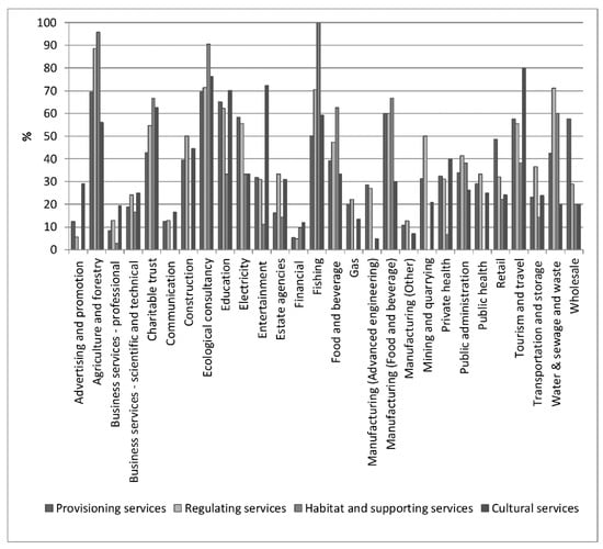 The fishing sector placed the highest importance on habitat and supporting ES (100%), followed again by the agricultural and forestry sector (95%) and ecological consultants (90%). Manufacturing (food and beverage) businesses also placed a high importance on habitat and supporting ES (66%) the fourth highest, followed in joint place by charitable trusts (66%), food and beverage (62%) and the water, sewage, and waste sector (60%). These sectors along many others recognized the importance of biodiversity, habitats for species and genetic flows within ecosystems, but this category also proved the most divisive with eight sectors placing no dependence (0%) on any of the supporting or habitat services.