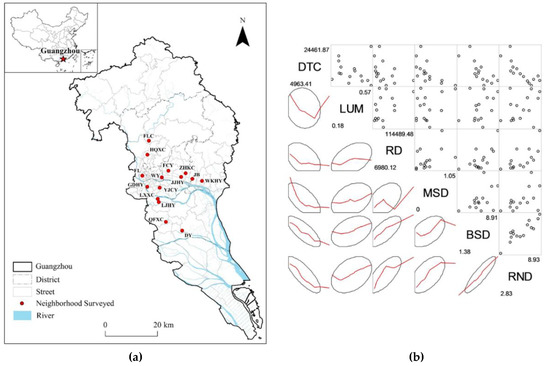 (a) The spatial distribution of the neighborhoods surveyed; (b) the scatter plots and fitting curves between built environment elements.