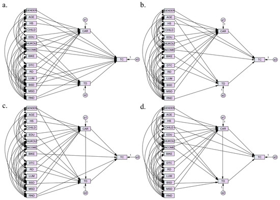 The SEM path diagram for commuting trips (a), social trips (b), recreational trips (c), and daily shopping trips (d).