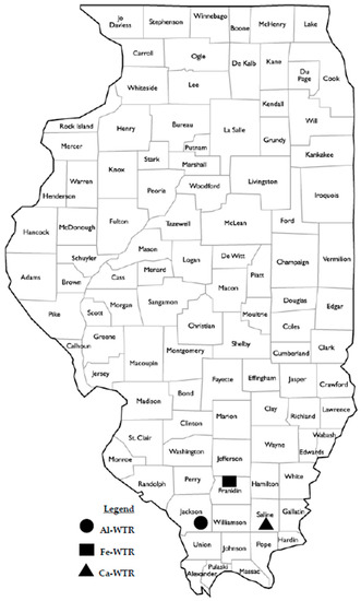 WTR samples were collected across the length of the dewatering ponds from three community drinking water treatment facilities in Southern Illinois in the United States, including the City of Carbondale Water Treatment Plant in Jackson County, IL; Rend Lake Conservancy District Water Treatment Plant in Franklin County, IL; and Saline Valley Conservancy District Water Treatment Plant in Saline County, IL. The City of Carbondale Water Treatment Plant utilized an alum coagulant to remove part of the total suspended solids and biochemical oxygen demand from the raw water. The Rend Lake Conservancy District Water Treatment Plant utilized a FeCl3 coagulant with CaO for precipitation and softening purposes. The Saline Valley Conservancy District Water Treatment Plant treated groundwater and produced a softening residue with high concentrations of CaO. Figure 1 shows the county map of the State of Illinois with sample sources identified by their counties.