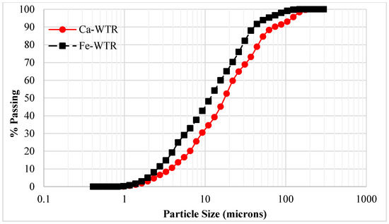 The analytical results of the selected properties of the WTR samples are shown in Table 1. The measured pH of WTRs ranged from 7.0 to 9.1. Specifically, the Ca-WTR and Fe-WTR samples were higher than typically reported pH ranges of WTRs mostly between 5.10 and 8.00 [11,39,40]. The alkaline pH of the Ca-WTR (pH ~9.1) and Fe-WTR (pH ~8.4) produced a high acid neutralizing potential. The effect of drying on the particle size characteristics of the collected Al-WTR sample, in particular, was found to be significant, as dried samples formed hard, stable, and coarse aggregates. Hence, the particle sizes of the Al-WTR were not determined, as it would not have been representative. The textural analysis (shown in Figure 3) of Ca- and Fe-WTRs showed 76.1% and 75% of silt, respectively, in the Wentworth grain size range of 0.39–63 microns. The Ca-WTR recorded 12.5% fine sand particles, which was more than Fe-WTR, which recorded 5.0%. Since coagulants enhanced settling of fine particles out of the solution, the residues were expected to exhibit high clay and silt fractions. However, fine particles coagulated into larger stable aggregates (flocs), which became stable and coarse once dried, through the influence of interparticle bonds. The particle size analysis was not performed for the Al-WTR, because of the formation of a coarse texture when air-dried although, it was likely that the dried Al-WTR would disintegrate into its constituent fractions when in contact with water for a longer period. Such scenarios might lead to the clogging of the soils pores and result in reduced hydraulic conductivity and water retention in soils that were amended with Al-WTR. According to Titshall and Hughes [11], this might increase the reactive sites for the release of potentially toxic elements from the WTR into the soils systems.