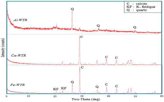 The identification of mineral phases is shown in Figure 4. Generally, the samples showed the presence of clay and non-clay minerals, as well as a significant amount of amorphous materials. The dominant minerals in the WTRs samples were mostly calcite, quartz, and feldspar. Although it was not recorded in the Al-WTR, calcite was the most dominant mineral in the Fe-WTR and, obviously, the Ca-WTR, which resulted from the lime that was used at the respective treatment facilities. The presence of quartz in the WTR samples was possibly a result of the varying amounts of suspended sand particles that were removed by the coagulants. The Ca-WTR, which was collected from the facility that treated groundwater, did not show any quartz in the XRD spectra. However, the Al- and Fe-WTRs that were collected from the facilities that treated surface water showed various peaks for quartz. Aside from the amounts of quartz in the Al-WTR, the XRD pattern consisted largely of disordered materials, possibly amorphous hydrous metal oxides—Al(OH)3 from the reaction of alum in water with bicarbonate—and organic fractions. This finding was consistent with Titshall and Hughes [11], and Ippolito et al. [48]. A similar reaction was reported for iron–salt coagulants. The less-crystalline nature of the WTRs, the presence of metal (hydr)oxides, and their porous structure were major characteristics that influenced their metal ion adsorption capacities. Hence, WTRs could be presented as competitive options for remediating heavy metal contaminated aqueous solutions and soil.
