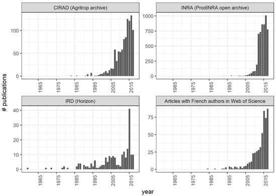 The dynamics of agroecology use in three significant agricultural French research institutes (CIRAD, IRD in Southern countries and INRA in France) and in French academic articles indexed in Web of Science is presented in Figure 1. All sub-figures show a small number of publications containing the word, followed by an increasing use pattern since around 2005 but with some temporal and volumetric differentiations between institutions. Indeed, agroecology is first found in the IRD (previously ORSTOM) archive in 1957 within the title of a report [34] of Robert Dufournet, an agronomist based in Madagascar. This first attested use of agroecology, mainly as synonyms of “pedo-climatic”, is followed by sporadic mentions. After 1985, about 10 publications per year contain the word agroecology, except in 2015 with several chapters from a collective book on soil productivity restoration [35]. Indeed, CIRAD is the institution with the most significant and early investment in agroecology with an exponential number of publications since 1995, after some sporadic mentions following a report from René Billaz in 1981, on research for the development of rural areas [36].