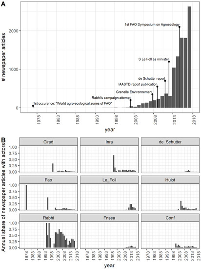 Dynamics of public attention to agroecology in the French mass media corpus: (A) Evolution of the number of newspaper articles mentioning agroecology with a projection of some meaningful events and (B) Evolution of the annual share of newspaper articles mentioning key actors (author: G. Ollivier).
