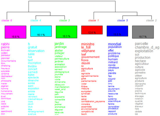 In the 1980s, most of the investment in agroecology could be attributed to social movements. Among them, the NGO “Nature & Progrès” and the NGOs created by Pierre Rabhi played a key role. Both are related to organic agriculture in terms of their purpose or of the history of their leaders. As in other countries, some individuals strongly embodied their association(s), especially P. Rabhi (for a more complete analysis of the trajectory of this “peasant-philosopher”, see [5]). He helped to open a new path, positioning agroecology as an “ethics of life”. As Figure 2 and Figure 3 (classes 6 and 4) show, his vision has been widely publicized through conferences, ecosites, training, publications, and political engagements, including his bid for the 2002 French presidency. Both his presence in the public arena and the many organizations he created (Terre & Humanisme, Colibris, Mouvement des Oasis en Tous Lieux, Mouvement Appel pour une Insurrection des Consciences, Fondation Pierre Rabhi, Kaizen magazine, etc.) are markers of his institutional activism, allowing him to enlist many influential people from the world of show business (singers, comedians) and politics, particularly Nicolas Hulot, the current French Minister of Ecology [39].