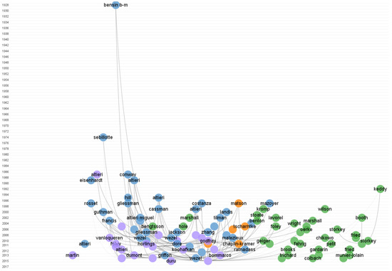 Direct citation network showing the 100 most highly-cited papers in the 247 articles of the French academic production on agroecology in Web of Science (1956–2018), using CiteNetExplorer [146]. Each circle stands for a publication, circle color indicates membership to community detected through Blondel algorithm [32], and links are direct citation between papers (author: G. Ollivier).