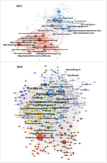 First, to map the online public sphere involved in agroecology, we used web crawlers [27,28]. Crawlers are software that allow the automatic extraction of hyperlinks between websites. We selected iteratively the relevant websites to be crawled to their use of the terms related with agroecology. The data collected can then be analyzed using social network analysis methods. Indeed, empirical studies of the Web showed a correlation between the structural position in the network of hyperlinked websites and positions with respect to the issue they treat [29,30]. Moreover, many webometric studies showed that creation of hyperlinks is a strategic choice of actors managing websites which has sociological significance (indicator of authority, ideological affiliation, institutional recognition of allied actors, political homophily, community and identity building) explaining the use of such hyperlink mapping in the analysis of social movements or political agenda-setting analysis [31]. Hyperlink mapping makes it possible to detect the most influential agroecology actors, the main cluster of actors (using Blondel community detection algorithm [32]) and finally to compare the evolution of the overall social morphology of the actor network interested in agroecology between our 2011 and 2018 mappings.