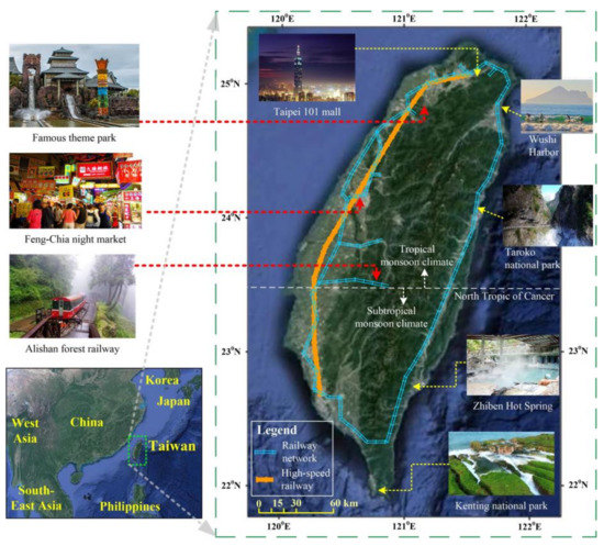 Taiwan’s topography is narrow at both ends, and the land area is approximately 36,000 km2 (Figure 1). Taiwan is located in tropical and subtropical zones and experiences four seasons; it has abundant natural tourist attractions, some of which include numerous mountains with peaks rising over 3000 m and nine national parks. Taiwan is also among the world’s top 15 hot springs sites. Moreover, Taiwan is known for its unique delicacies, and its night markets are popular tourist attractions. A convenient island railway network offer easy access to various tourists locations; moreover, the unique mountain railway line, Alishan Forest Railway, is itself a tourist activity. In addition, Taiwan has many large shopping centers, such as the Taipei 101 mall that offer various food, leisure, and entertainment services. Given the abundance of tourist activities, approximately 10.4 million international tourists visited Taiwan in 2015.