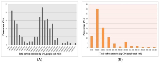 The estimated TolCO2 patterns identified from the CECs and the questionnaire responses are shown in Figure 2. Air transport generates the largest CE [9], as it is nearly unavoidable during international travel. Assigning jurisdictions for cross-border CEs are difficult [32]. Therefore, in this study, TolCO2 is reported with (Figure 2A) and without (Figure 2B) considering international transportation. When international transportation was included, TolCO2 ranged from 126.0 to 2077 kg CO2/person (Figure 2A) and was greater than that without international transportation (Figure 2B). No TolCO2 was less than 100 kg CO2/person, indicating that the lowest TolCO2 from international transportation was larger than 100 kg CO2/person. The visitor with the lowest TolCO2 was from Hong Kong and stayed in Taiwan for two days (Figure 2A), whereas the visitor with the largest TolCO2 was from Canada and stayed in Taiwan for 20 days. TolCO2 of 100–600 kg CO2/person was attributed to international travel with a flight time of less than 3 h; such visitors were mainly from neighboring countries, such as China and Japan. By contrast, longer international flights had larger contributions to TolCO2 (1200–1800 kg CO2/person); such visitors were mainly from Europe and the Americas.