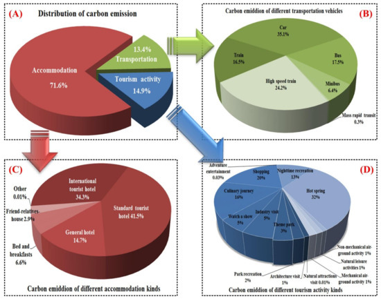 (A) Carbon emission (CE) without considering international flights and contributions to CE stratified by (B) transportation modes; (C) accommodation types; and (D) tourist activities.