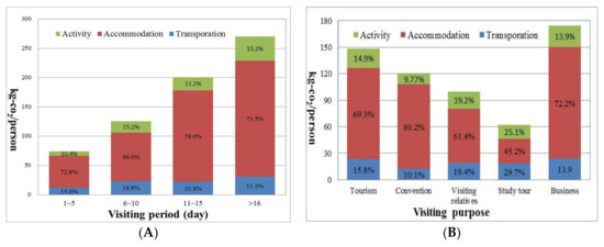 RCO2 contributed more than 70% to TolCO2, except when the visiting period was 6–10 days. This is due to a higher probability of such visitors staying in their friends’ or relatives’ house and engaging in more activities with higher TCO2 values. Most visitors travelled to Taiwan for tourism (50.5%), convention (26.9%), visiting relatives (12.6%), study (5.5%), and business (4.4%). Figure 4B shows the average TolCO2 for different visit purposes; visitors who travelled for business had the largest TolCO2 values (174.2 kg CO2/person), mainly because these visitors often stayed in international tourist hotels, which have the highest accommodation CEC. In contrast, visitors who travelled for study often stayed with their friends or relatives, which has a low accommodation CEC and thus generates the lowest RCO2 and TolCO2 (62.2 kg CO2/person). Similarly, visitors who travelled to visit relatives usually stayed in their relatives’ house, resulting in low RCO2 and TolCO2 values. Visitors who travelled for tourism and convention had similar RCO2 but different TCO2 and ACO2, mainly because these visitors engaged in many tourist activities.