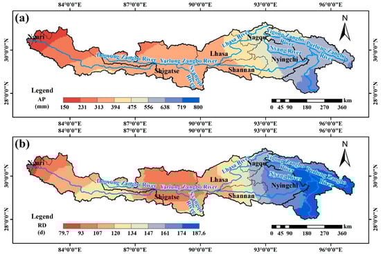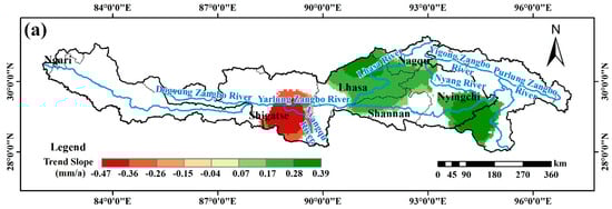 The spatial distribution of detected significant changes in AP, RD, and RI are shown in Figure 7. An increasing trend in AP was found in 50.8% of the basin area, with a maximum magnitude of 5.09 mm/a. This area is mainly located in the middle upper-reach, west middle-reach, and lower-reach regions. Pixels with a decreasing trend are located in the west of the upper-reach region, and cover 1.37% of the basin area. More than 75.8% of the area exhibits an increasing trend in RD. Only a limited number of pixels in the upper-reach region (0.9% of the total area) show downward trends. There is an upward trend in RI in some parts of the Lhasa River Basin and the lower-reach region near the basin outlet while the Nyang River Basin in the Shigatse region has a decreasing trend.
