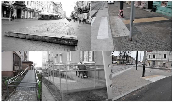 The key objective of the discussed idea is promoting equality and providing full accessibility and inclusion in social life for persons with reduced functionality, by eliminating the existing barriers, which in the opinion of the disabled persons, are particularly oppressive and stigmatizing, and are considered to be incompatible with the principles of universal design (Figure 1). Another aim is preventing the creation of new spatial barriers within the ongoing programs of cities’ revitalization. The universal design concept has been gaining large popularity in the analytical discourse, because it indicates new pathways of thinking and is based on the idea of social egalitarianism to a broader extent than the general accessibility concept, due to the fact that “the principle of universal design assumes that the basic actions and solutions will by rule fulfill the needs of all users” [].