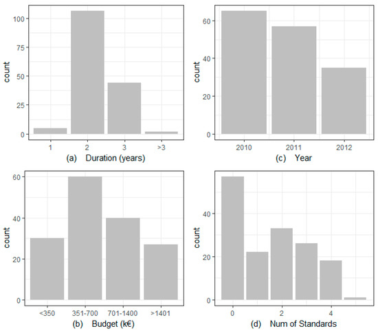 Number of projects classified according to the variables: duration, budget, year of application and number of certifications.