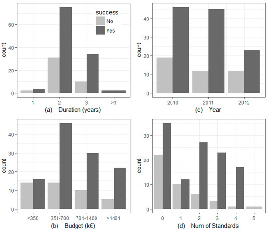 The analysis tests the influence of the four variables considered (duration, budget, year of application for the funding and management system certifications) on the success of the project. Of the 157 projects analyzed, 114 were completed successfully. The remaining 47 have been considered as unsuccessful (27.4%), according to the success criteria adopted. Figure 2 shows the number of projects that were successfully completed based on the aforementioned four variables.