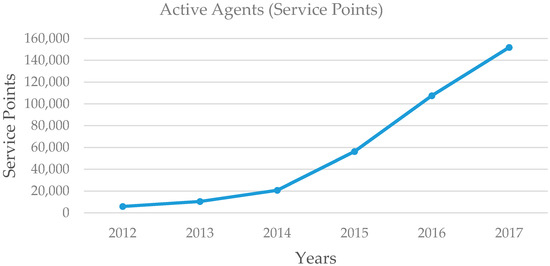 Graph of number of active mobile money agents or vendors or service points in Ghana. Source: Authors’ drawing from Bank of Ghana’s raw data in 2017.