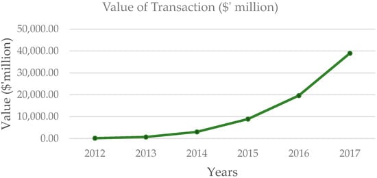 Graph of value of transactions per year in the mobile money space. Source: Authors computation from Bank of Ghana’s raw data in 2017.