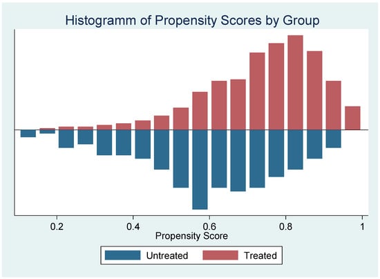 According to Heckman, Ichimura, and Todd [36], although the PSM is able to remove the systematic observable difference between users and non-users, it reduces the efficiency of the estimation. Therefore, we further conduct an inverse propensity score weighting regression to achieve consistency in estimates in a process known as “doubly-robust” estimation [37]. This method uses the inverse of the propensity score as weights to run a regression of the outcome variable, as proposed by Robins and Rotnitzky [38] and as later improved by Hirano, Imbens, and Ridder [39]. Here, the weight is equal to one for observations that are users, and px(x)/(1 − ps(x)) where ps is the propensity score for non-user observations [40,41].